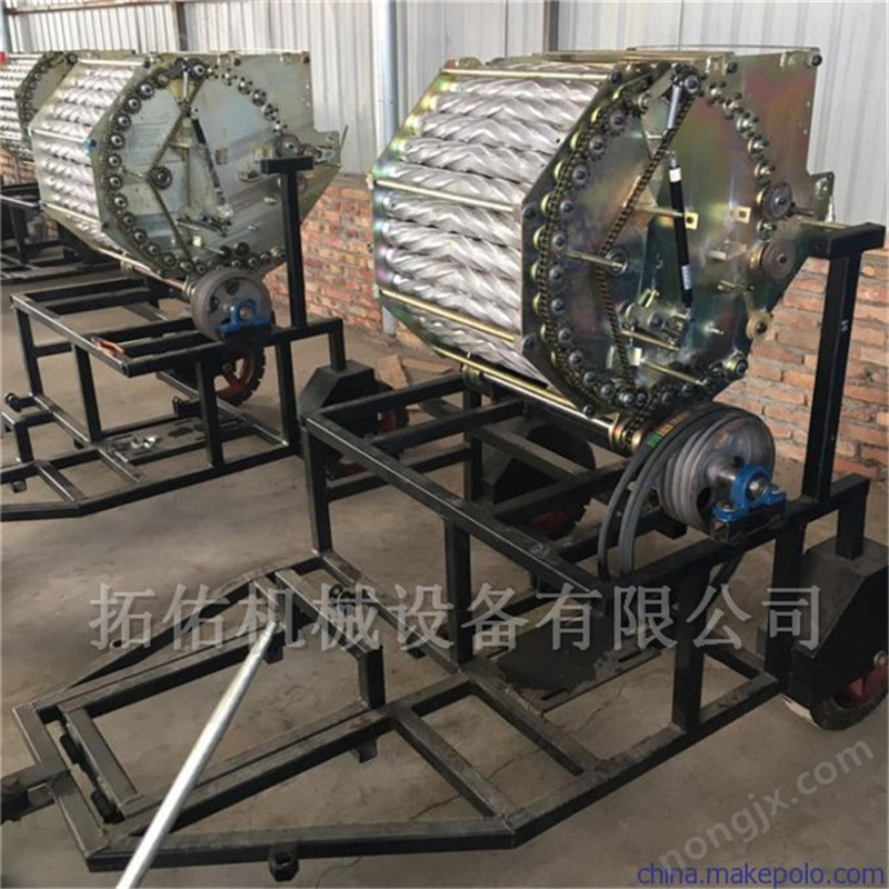 青貯打捆包膜一體機有打捆、包膜兩部分組成,通過機器前部人工給固定倉喂料,當草捆大到固定倉和活動倉接觸到一定密實度時,活動倉上方的惰性輥和左側的信號輪會均勻轉動,操作者板動繞線離合手柄,機器開始往復饒繩捆扎,繞繩一周,麻繩自動切斷,立即開倉放捆,草捆直接落入包膜機的旋轉架上,用手把膜拉出,啟動旋轉按鈕,旋轉架帶動草捆轉動,操作者應同步迅速將膜壓向草捆,并隨著草捆旋轉一周,然后立即松手,牧草膜逐漸逐層包裹在草捆外,草捆自隨著旋轉架公轉,當包膜到設定的層數(shù)時,離合器自動脫開,旋轉架停下,操作員在草捆和輸膜架之間把牧草膜切斷,把牧草膜斷頭一端壓入草捆端面重疊處,用一人將包膜好的草捆搬入小推車內(nèi),推走擺放整齊。