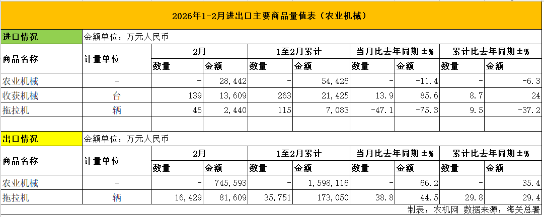 2026年1 - 2月我國農機累計出口金額同比增長35.4%