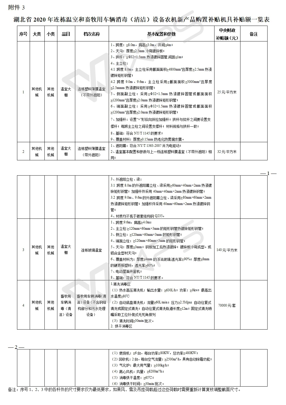 產品補貼標準:連棟溫室和畜牧用車輛消毒(清潔)設備新產品實行定額補貼。補貼額原則上依據試點產品近兩年市場銷售均價的30%進行測算。試點產品分檔參數及補貼額詳見《湖北省2020年連棟溫室和畜牧用車輛消毒(清潔)設備農機新產品購置補貼機具補貼額一覽表》。