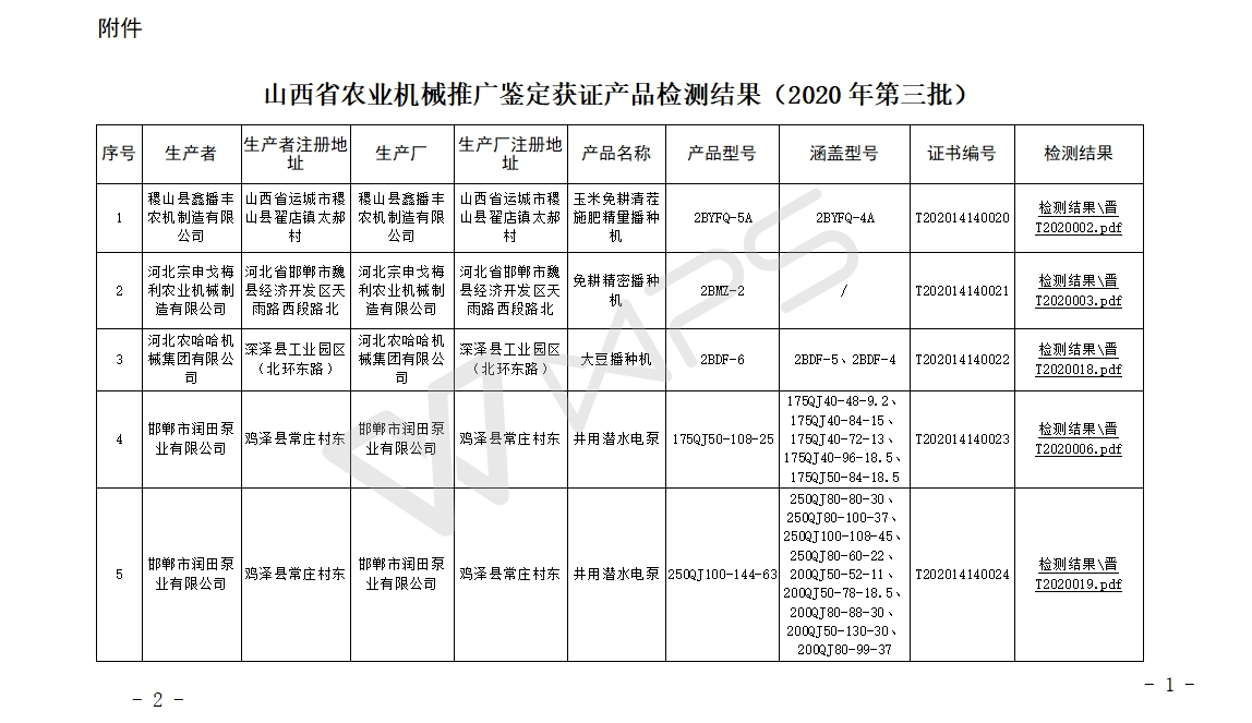 山西省關于公布2020年第三批農業機械推廣鑒定獲證產品檢測結果的通知