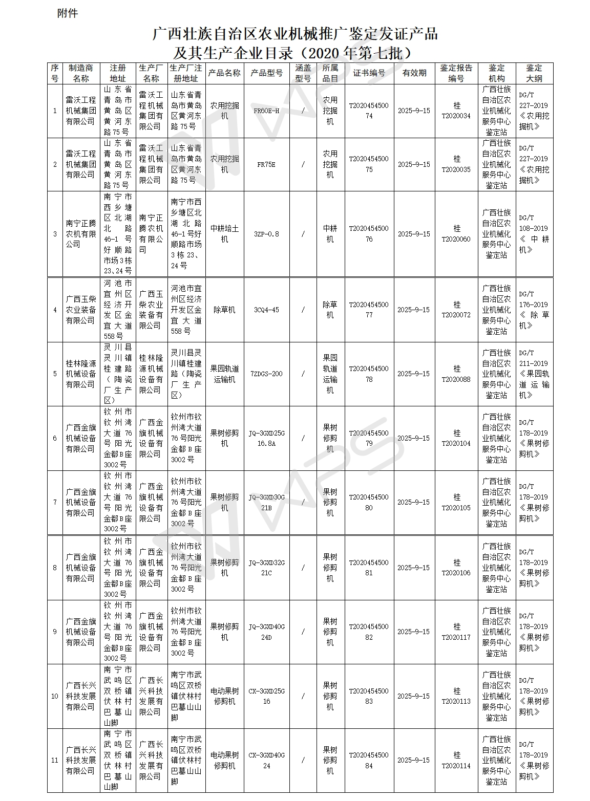 附件:廣西壯族自治區(qū)農(nóng)業(yè)機械推廣鑒定發(fā)證產(chǎn)品及其生產(chǎn) 企業(yè)目錄(2020年第七批)
